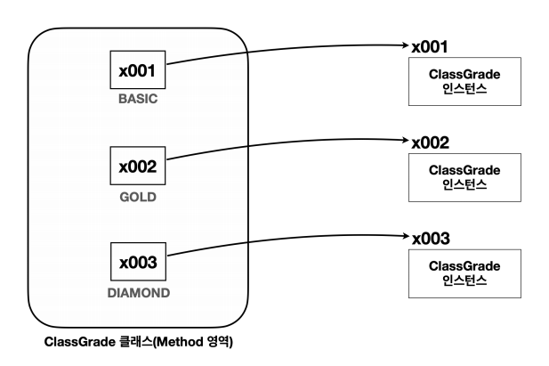 서드의 매개변수로 ClassGrade 를 사용하는 경우, 앞서 열거한 BASIC , GOLD , DIAMOND 만 사용할 수 있다.