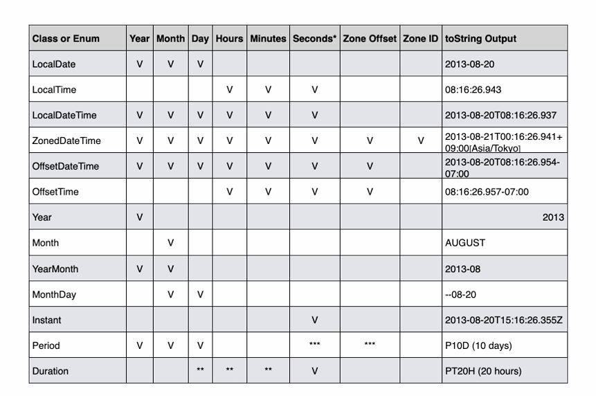 - LocalDate 와 LocalTime을 합한 개념. ex) 2013-11-21T08:20:30.213