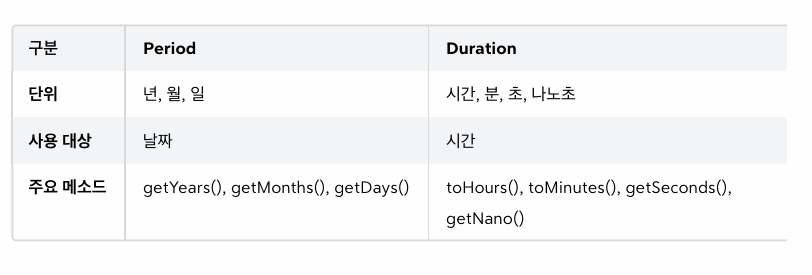 - Period.between(startDate, endDate)와 같이 특정 날짜의 차이를 구하면 Period가 반환된다.